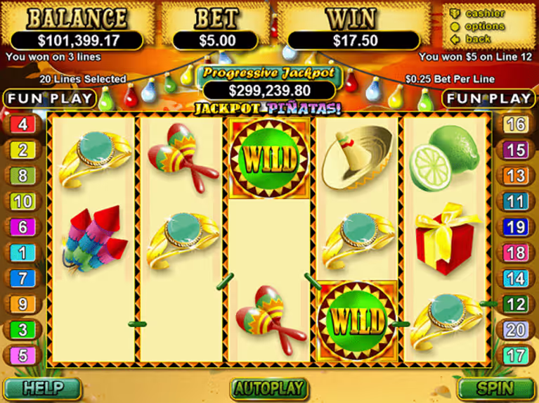 The betting range in Jackpot Pinatas Slots is designed to accommodate all players, from casual gamers to high rollers. With coin sizes starting at 0.25 and a maximum bet of 5 per spin, players can adjust their wagers to suit their budget. The game offers a Return to Player (RTP) of around 95%, which is standard for a progressive slot. This RTP, combined with the game’s medium volatility, provides a balanced experience where players can enjoy steady wins while chasing the elusive jackpot.